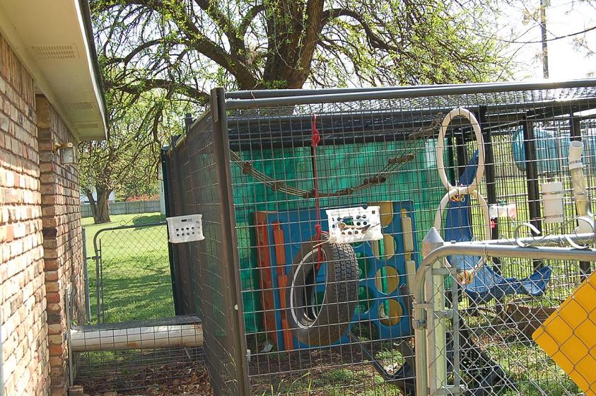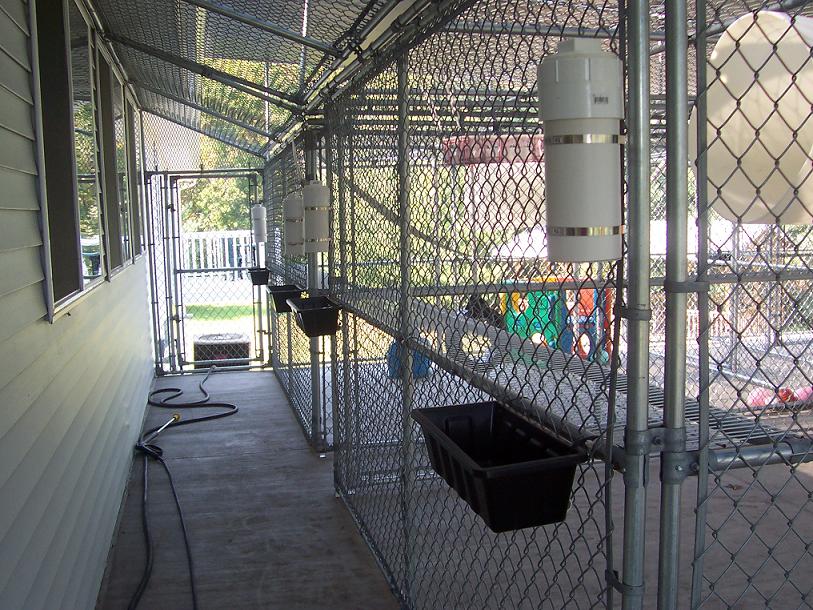 Caging at private owner home for capuchin monkeys. Has outdoor caging that connect to indoor room. The two outdoor cages connect to each other, which then have a tunnel to indoor room. Outdoor caging has perimeter fence.