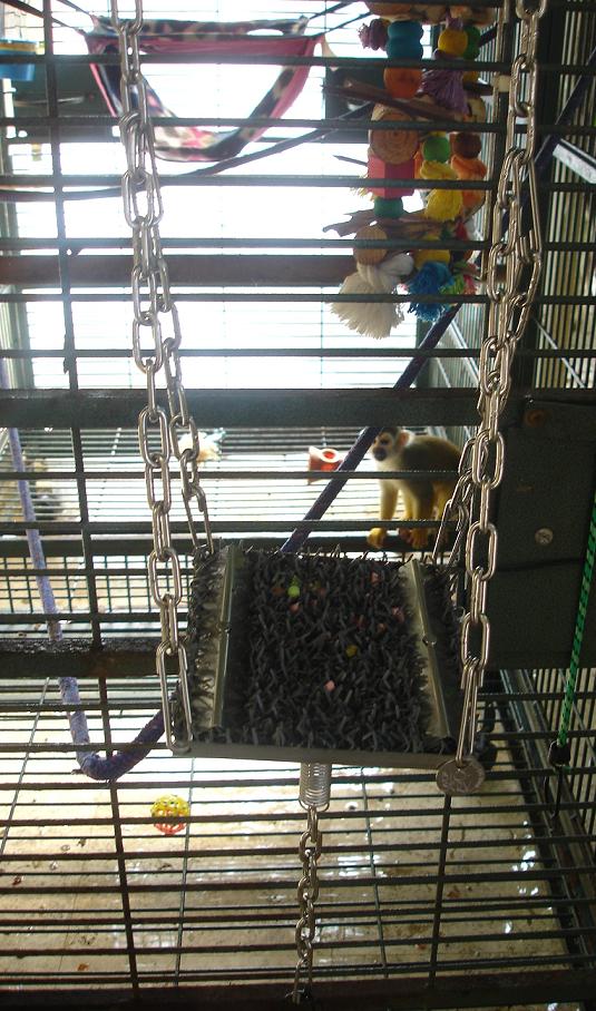 Other items are manipulative toys which can be hung inside or outside of the cage. Treats are inserted into the toy, and the pet monkey has to manipulate the toy in order to retrieve the treat.