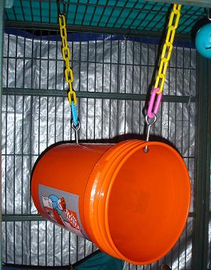Many owners use old tires, and firehoses inside cages so they can hang and swing from. Another great idea is using large wood barrels as nest boxes.