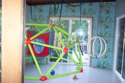 Dome jungle gym suspended above floor.