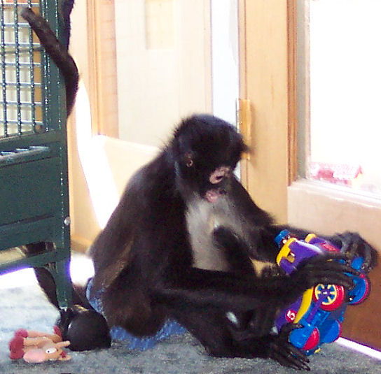 Jimi, male spider monkey, pictured at 3 years old. Jimi was playing with his new toy.