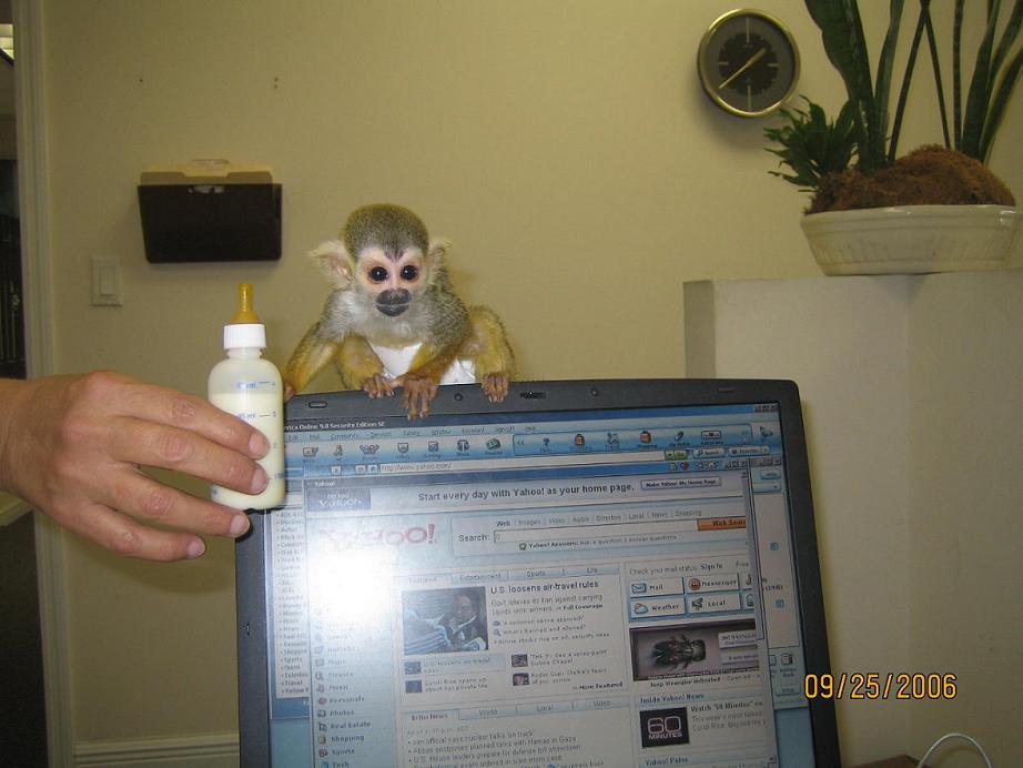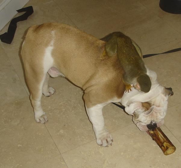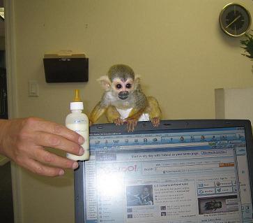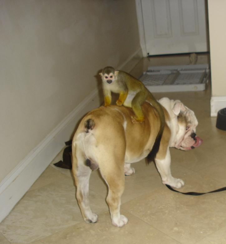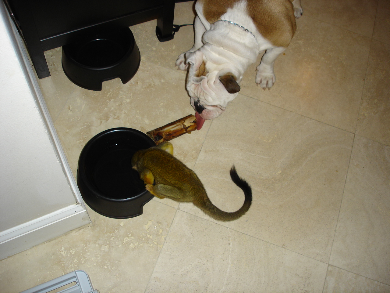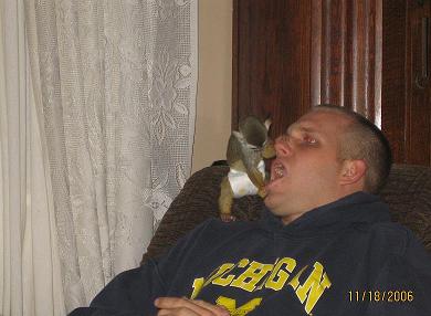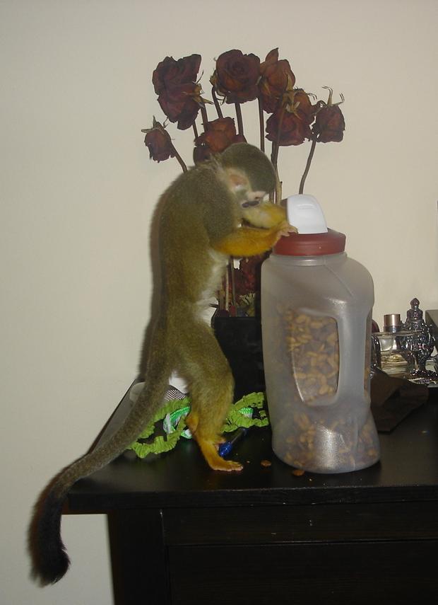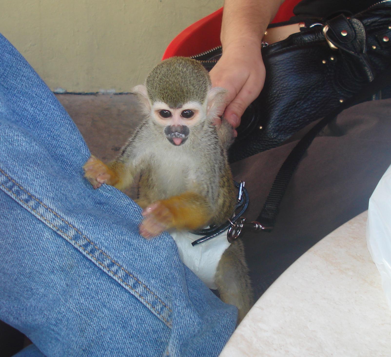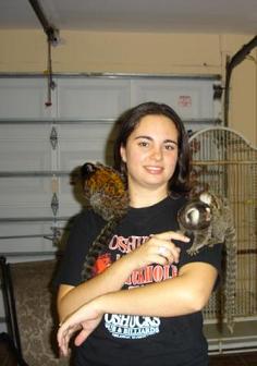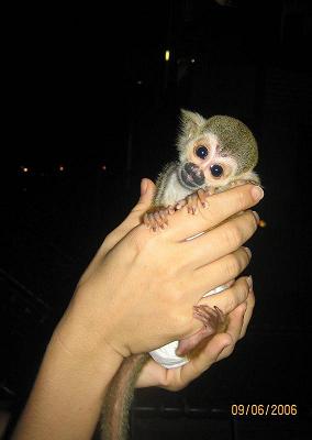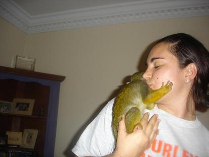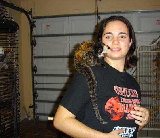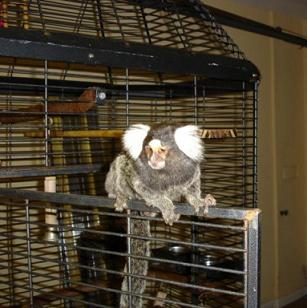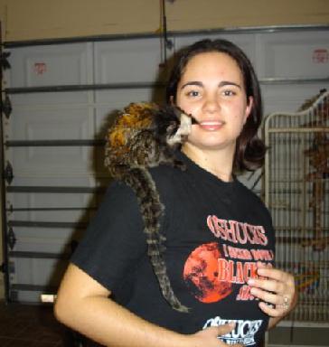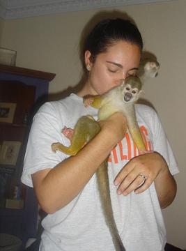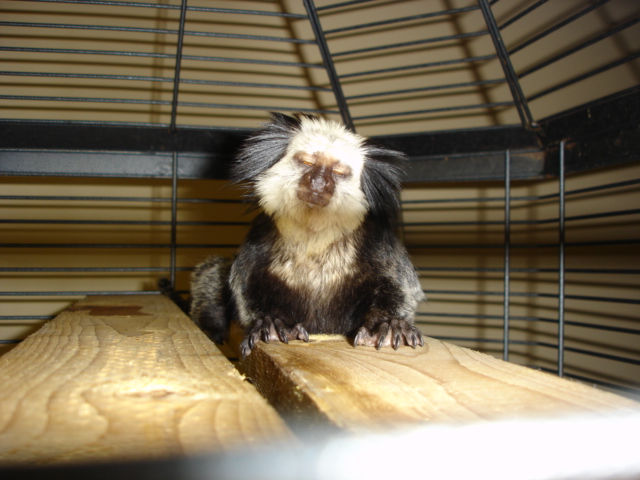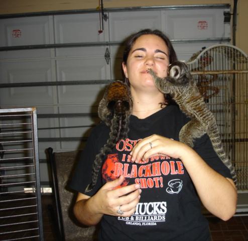 Male Common Marmoset, Coco, and a female Geophrey marmoset, Tiffany. They are about 3 years old. The male has the white ear tufts, and the female a white face. Coco was trying to get my food from my mouth in picture 2. They were pretty cool little guys. BUT they have a musky odor since they urine scent. (NOTE: Squirrel monkeys and marmosets can NOT be together under any circumstance. I had to keep these guys in my garage and not mix anything (food, toys, etc). Squirrel monkeys can be carriers of a virus that affects ONLY marmosets and tamarins.)